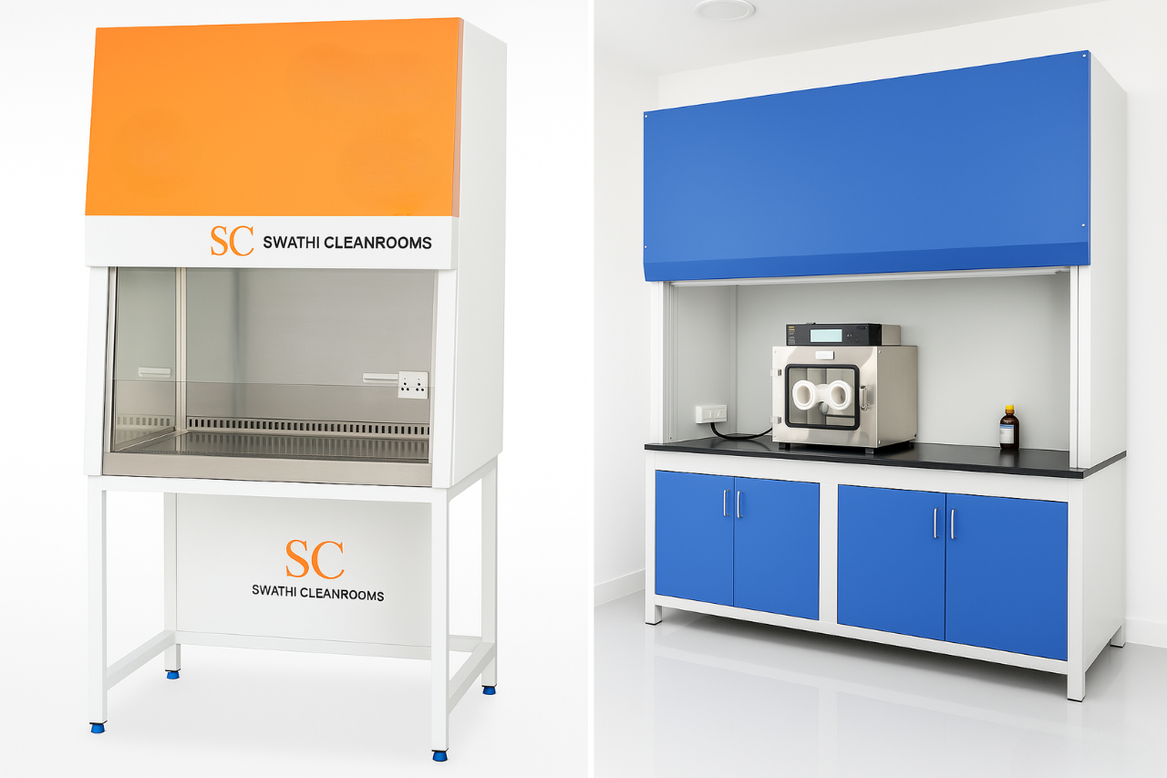 Side‑by‑side product families for containment and protection — Class II BSCs for biohazards and chemical fume hoods for vapors and gases.